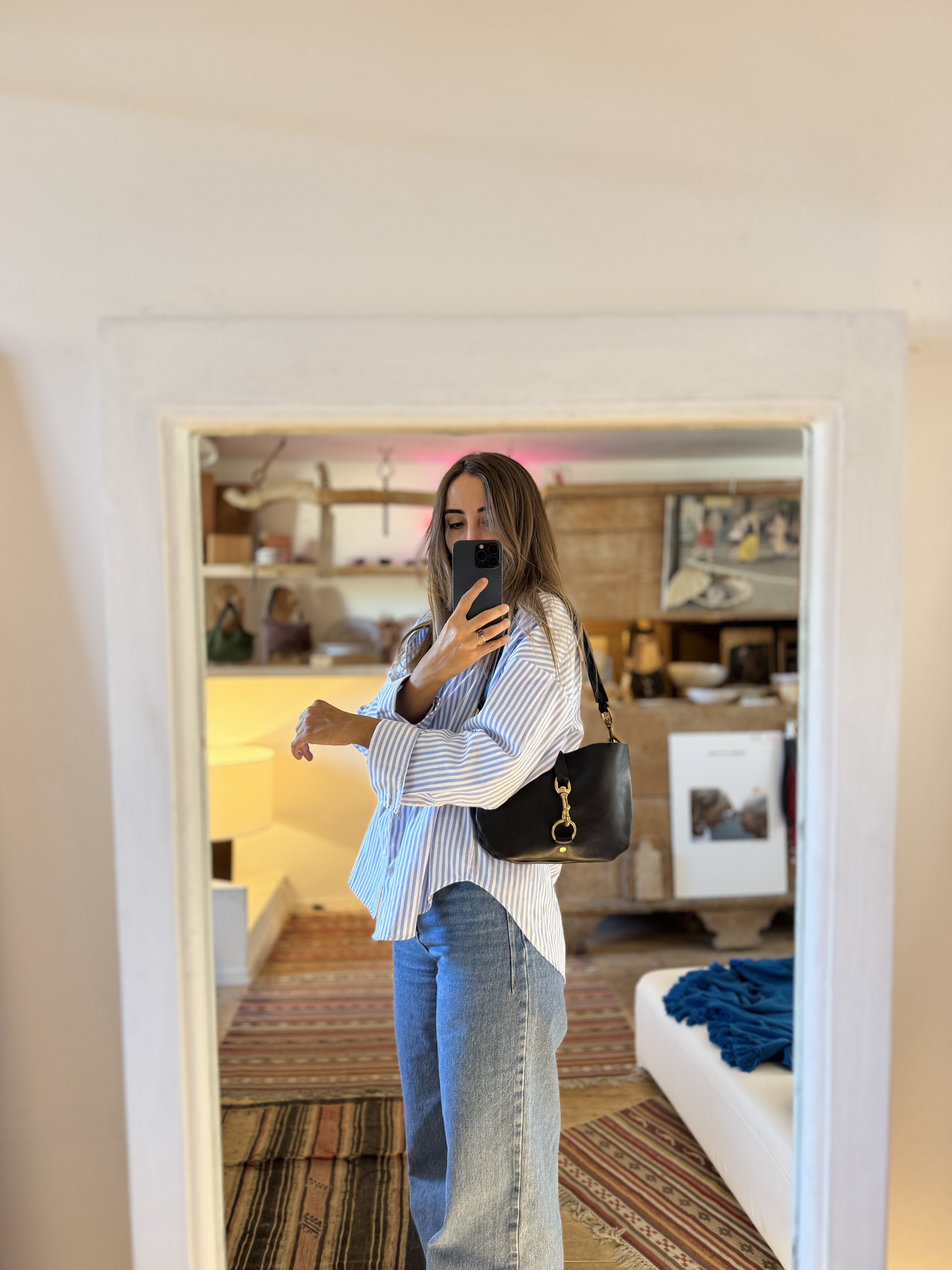 La Mini in pelle martellata nera conciata al vegetale con manico a tracolla in pelle e moschettoni in ottone.