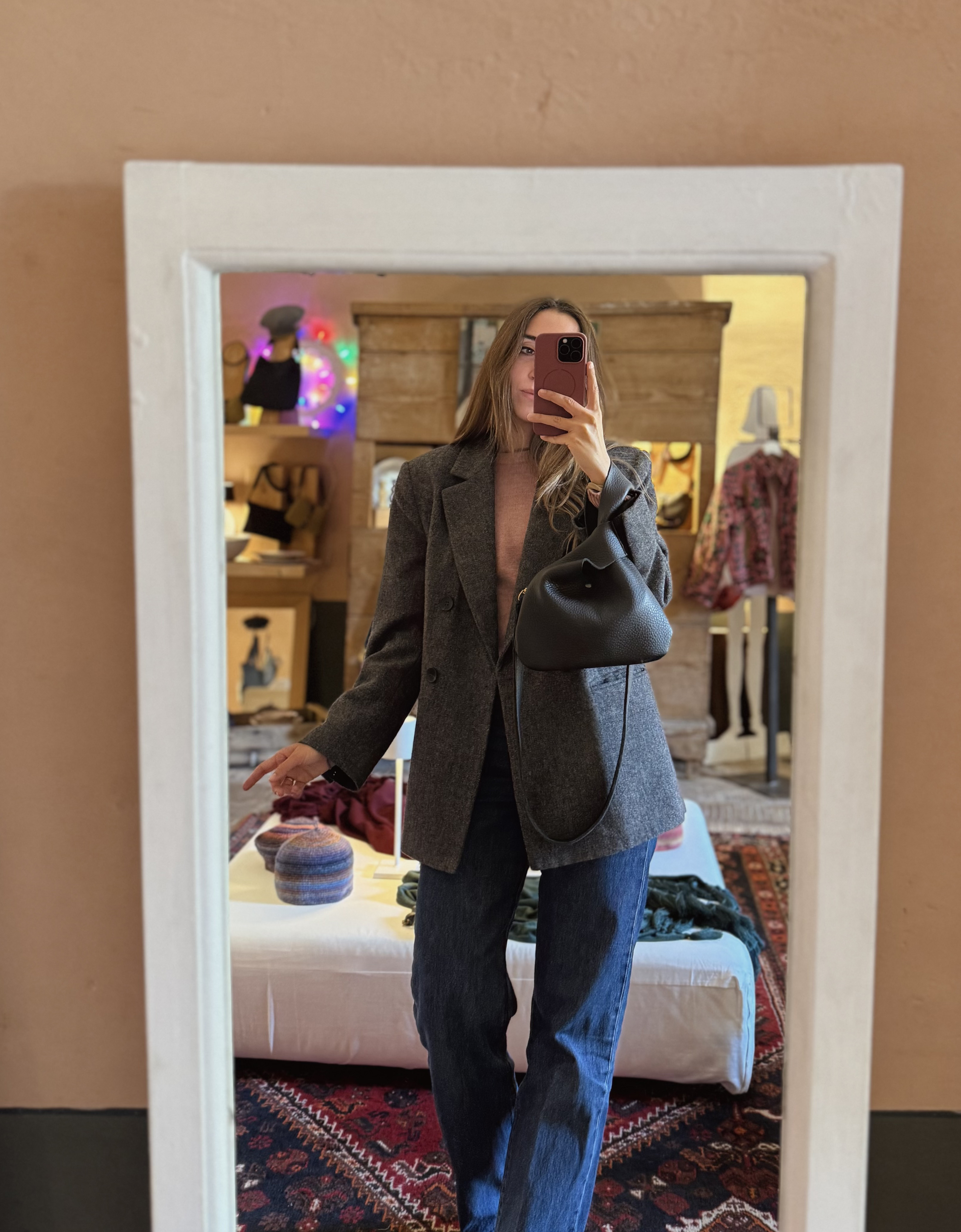 L'Aminta 2.0 in pelle martellata nera con bottone di chiusura.