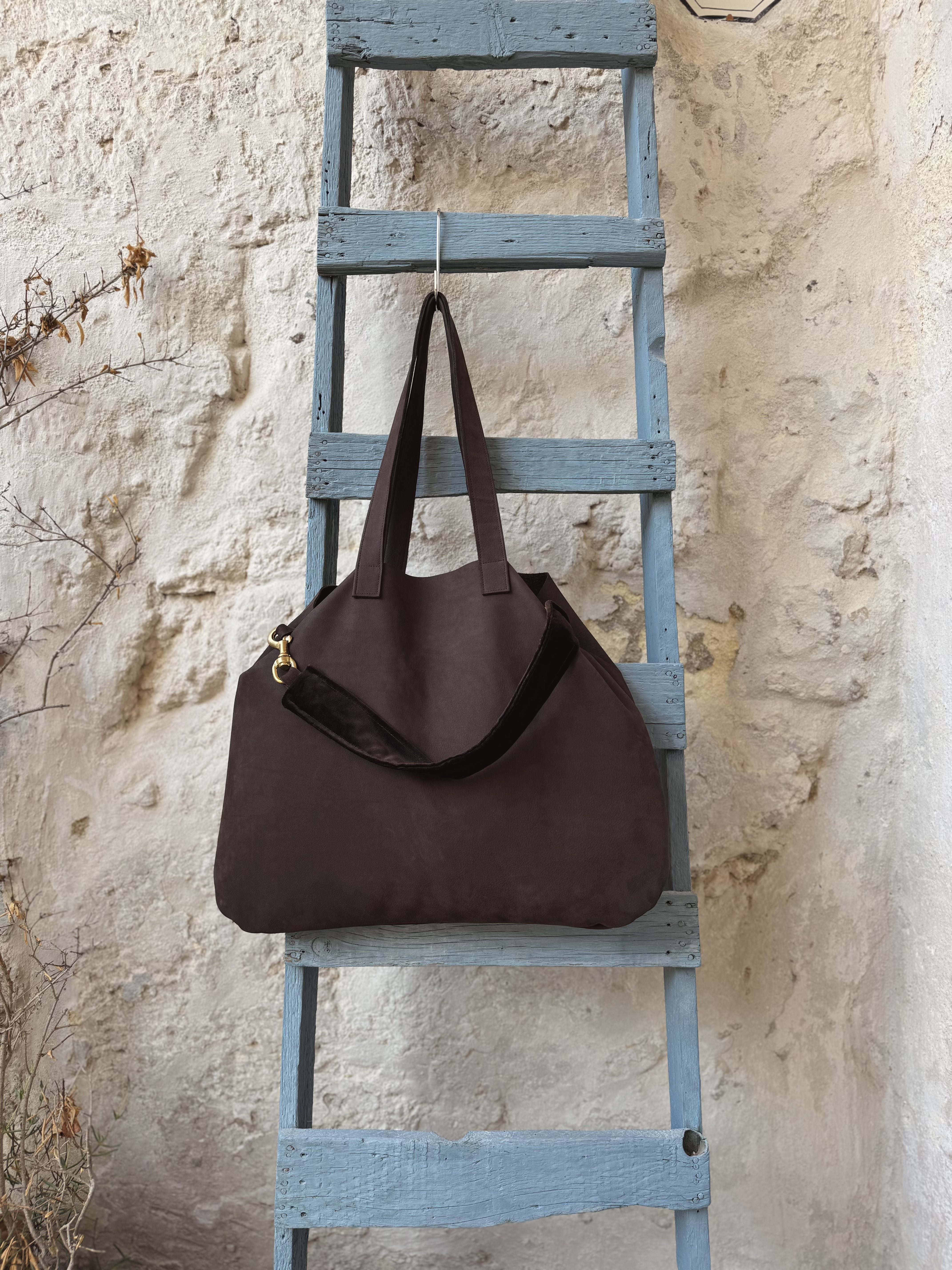 La shopper con manici in pelle in camoscio marrone.