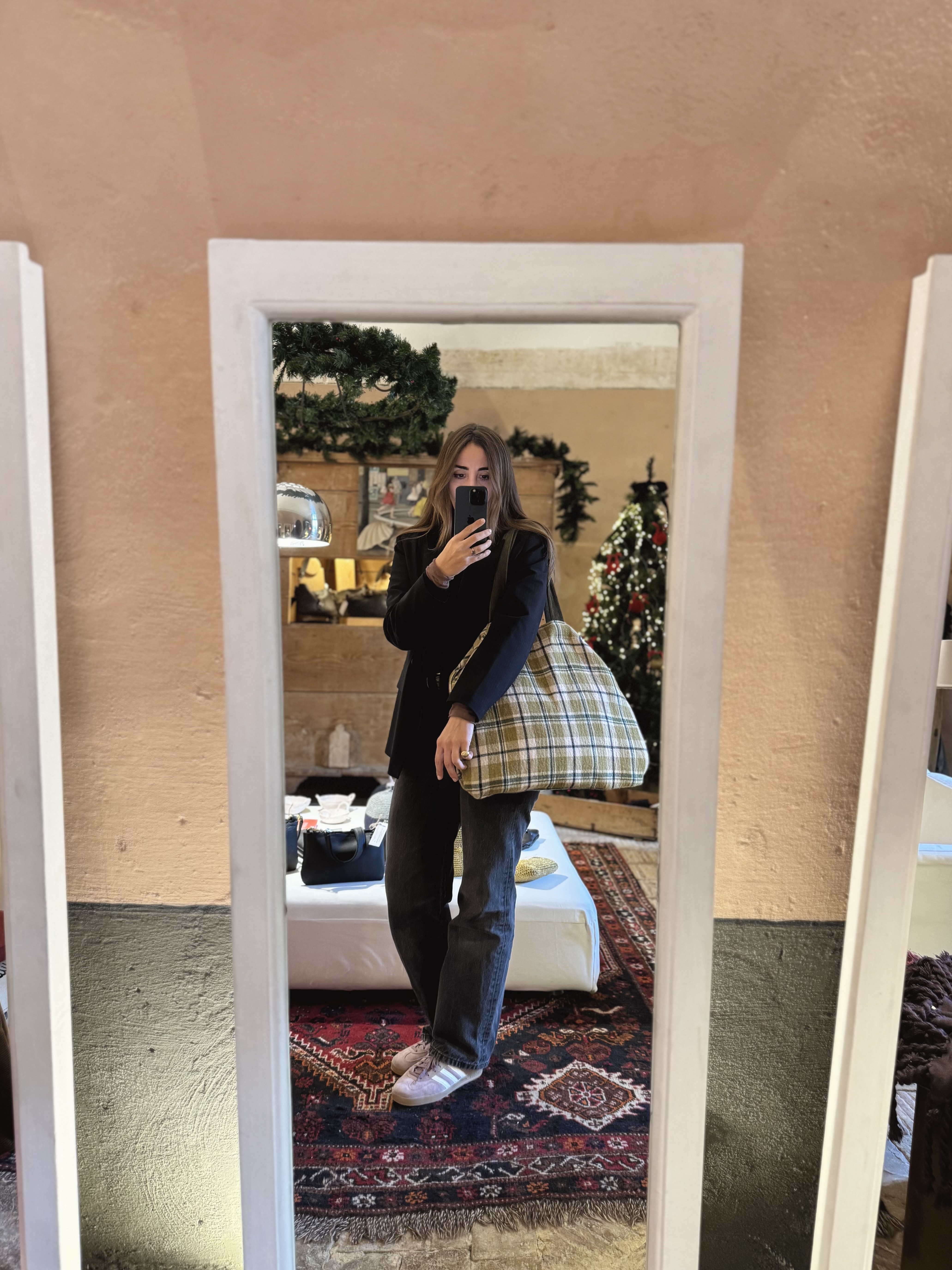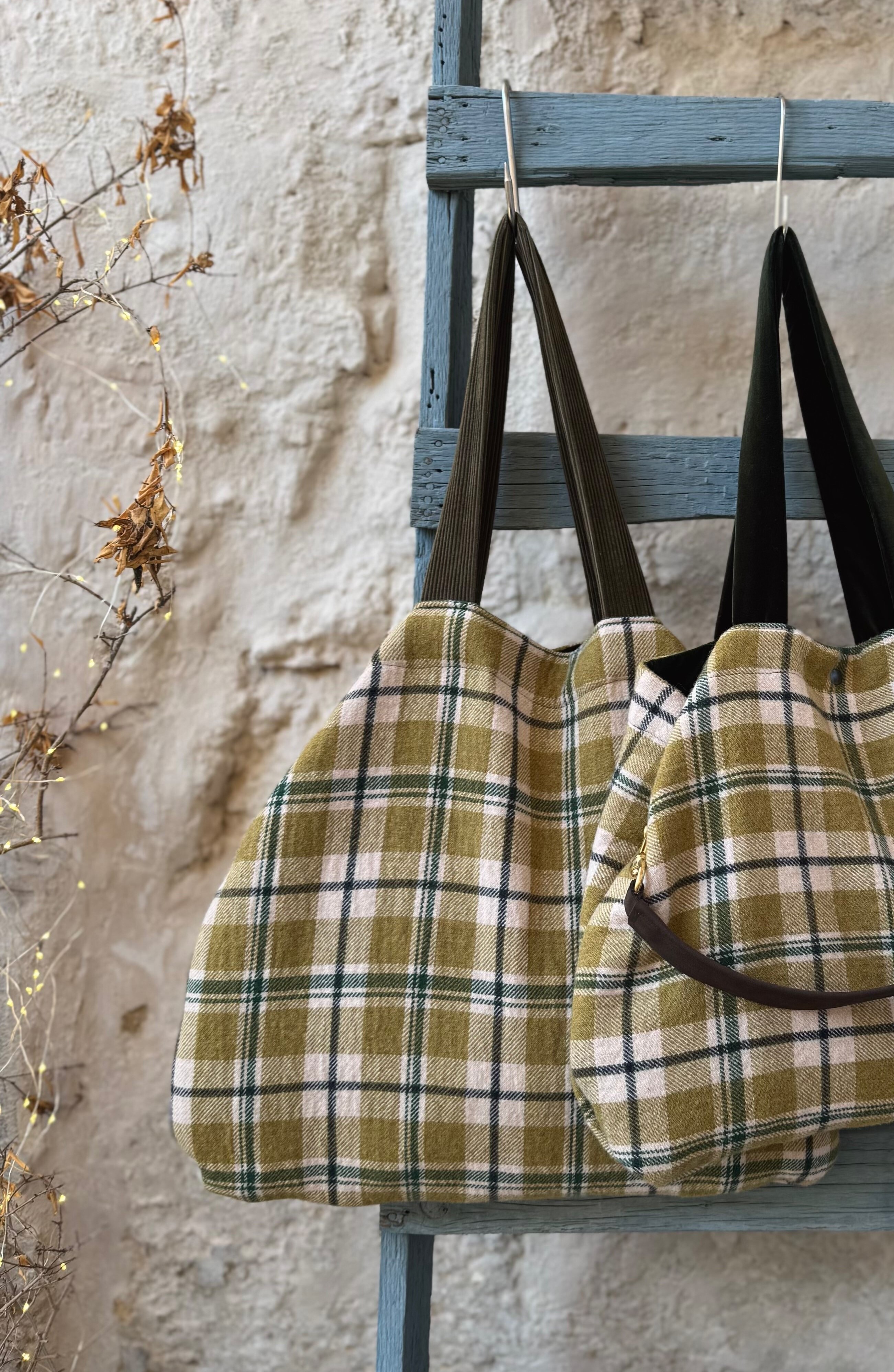 La shopper in lana scozzese con manici fissi in velluto verde a costine.
